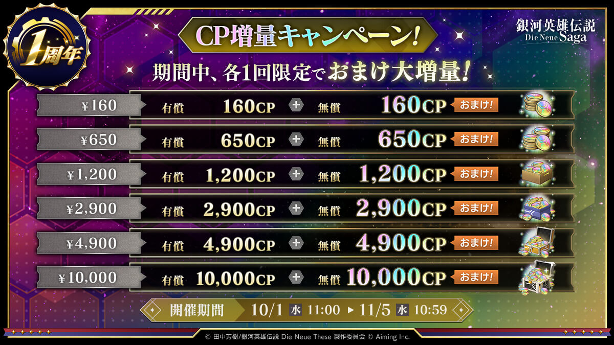 【10/1(水)15:30更新】「1周年記念 CP増量キャンペーン」開催!