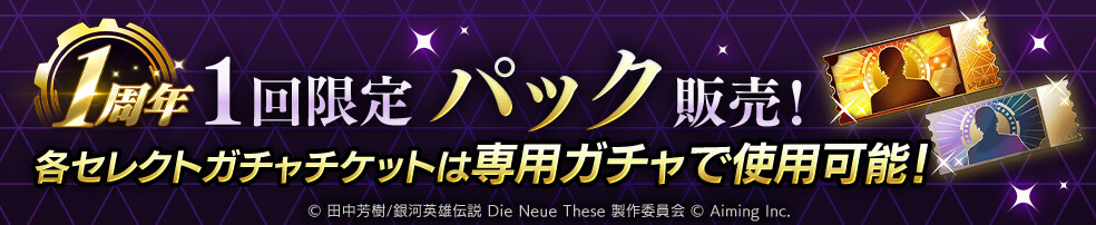 3種類の「1周年セレクトガチャチケットパック」と「【セレクトノイサガフェスチケット付き】1周年記念 特別パック」を各パック1回限定で販売中!